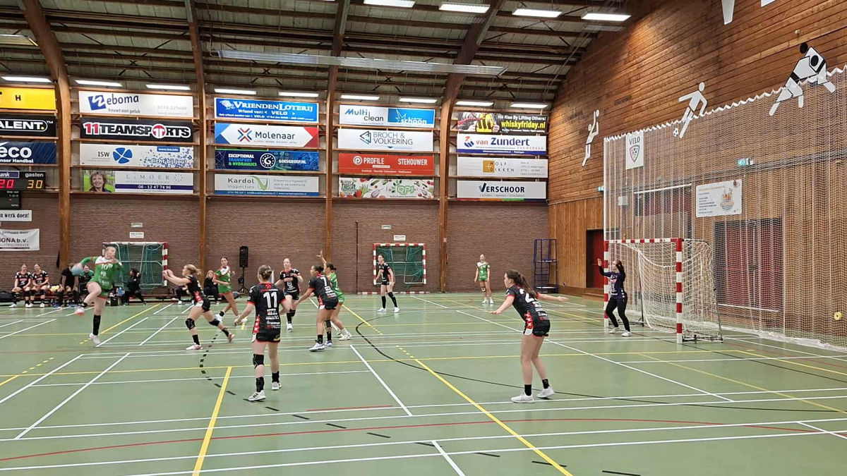 De eerste 8 minuten gingen volledig gelijk op. Toen stond het, mede door drie doelpunten van Maaike Moerman, nog 7-7. Daarna brak dus die mindere periode aan. Mede door zwak verdedigen en een te trage omschakeling, scoorde VOC vier keer op rij en nadat Kim en Nikki Schildmeijer ieder met een doelpunt iets terugdeden, scoorde VOC er nóg vijf op rij. Op dat moment stond het dus 9-16 en was de wedstrijd eigenlijk al gespeeld.
