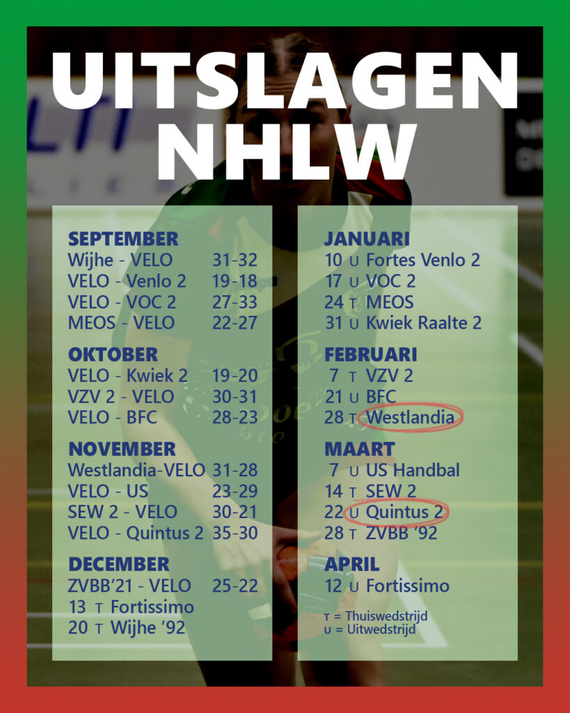 Door deze nederlaag is VELO gezakt van de zesde naar de achtste plaats. Komende zaterdag is Fortissimo de tegenstander in zaal 2. Door de overwinning van Fortissimo op Fortes Venlo zojuist hebben ook zij nu één punt meer dan VELO. Die wedstrijd zal dus gewonnen moeten worden om weer één of misschien beide plaatsen weer terug te winnen. Komen jullie ook onze dames steunen?