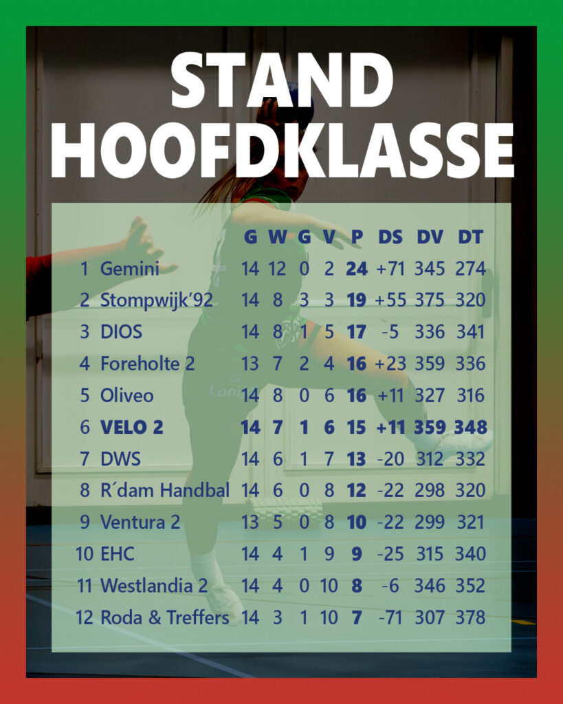 Door deze vierde overwinning op rij doet VELO, ondanks dat ze nog steeds zesde staan, bovenin weer helemaal mee. Het verschil met nummer twee Stompwijk is nog maar 4 punten. Aangezien dat volgende week de tegenstander is, kunnen er wederom goede zaken gedaan worden.