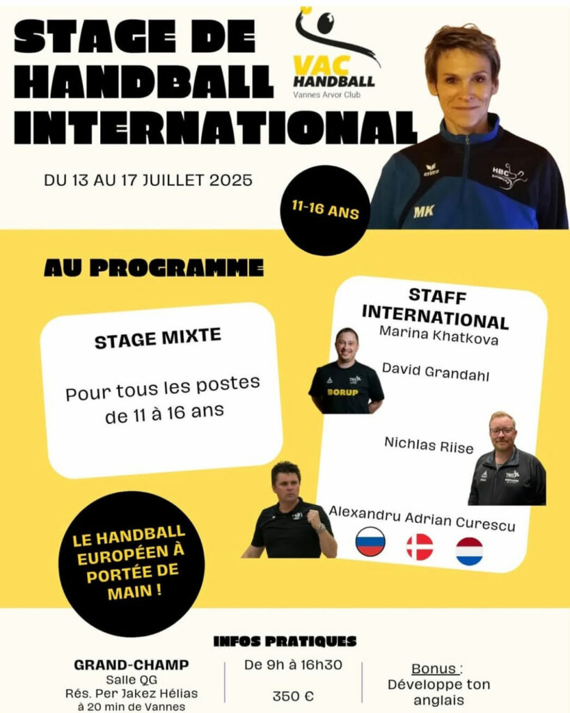 De tweede is het vijfdaagse Internationale Handbalkamp in Vannes, Frankrijk. Vannes Armor Club Handball organiseert dit uitzonderlijk internationaal kamp van 13 tot 17 juli voor spelers van 11 tot 16 jaar, onder leiding van een topteam van Europese coaches, zoals de Russische Marina Khatkova, de Deense David Grandahl en Nichlas Riise en natuurlijk onze Alexandru Adrian Curescu.