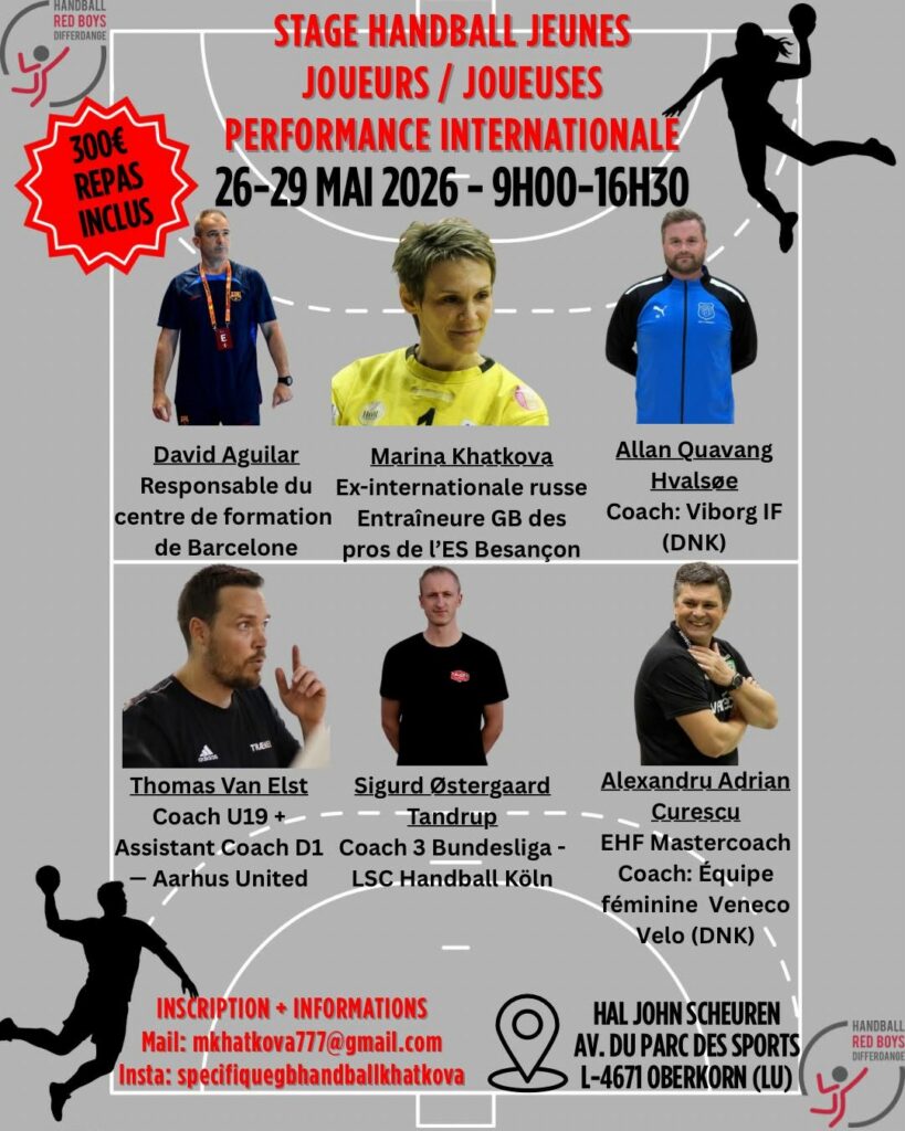 De eerste is het vierdaagse Stage Handball Jeunes – Performance Internationale, oftewel het Jeugdhandbalkamp – Internationale Prestaties dat van 26 tot en met 29 mei in Oberkorn, Luxemburg gehouden wordt.. Dat is een uitzonderlijk evenement dat internationaal gerenommeerde coaches samenbrengt om jonge spelers naar het hoogste niveau te begeleiden.