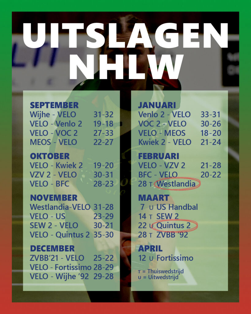 Doelpunten VELO: Kim Schildmeijer (5), Maaike Moerman (5), Nikki Schildmeijer (4), Bente van Steekelenburg (2), Quincy Fani (2), Lenna Houdijk (2), Lotte Duijnisveld (1) en Melike Pamuk (1).