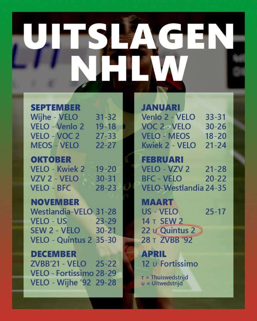 Doelpunten VELO: Kim Schildmeijer (7), Hayden van der Tier (4), Lotte Duijnisveld (2), Maaike Moerman (2), Quincy Fani (1) en Bente van Steekelenburg (1).